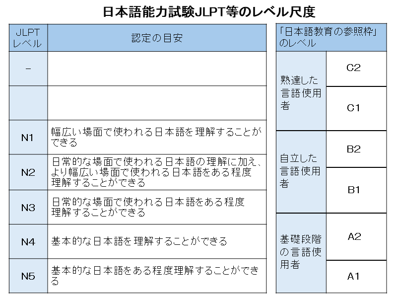 日本語能力試験(JLPT)と「日本語教育の参照枠」のレベルについては、以下のとおりです。