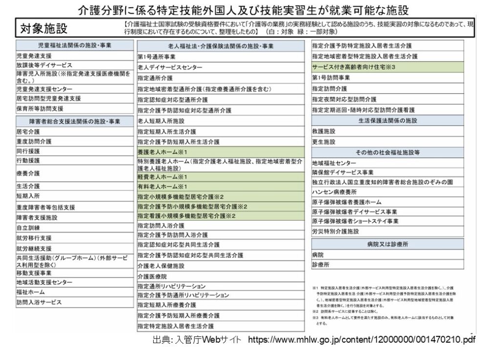 具体的には、入管庁のWebサイトに、介護分野の特定技能外国人が就業可能な施設が整理されて以下のように掲載されています。